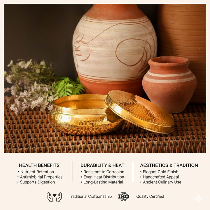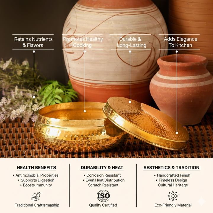 Brass has natural heat-retaining properties, which help keep chapatis warm and soft for 2–3 hours, depending on the surrounding temperature.