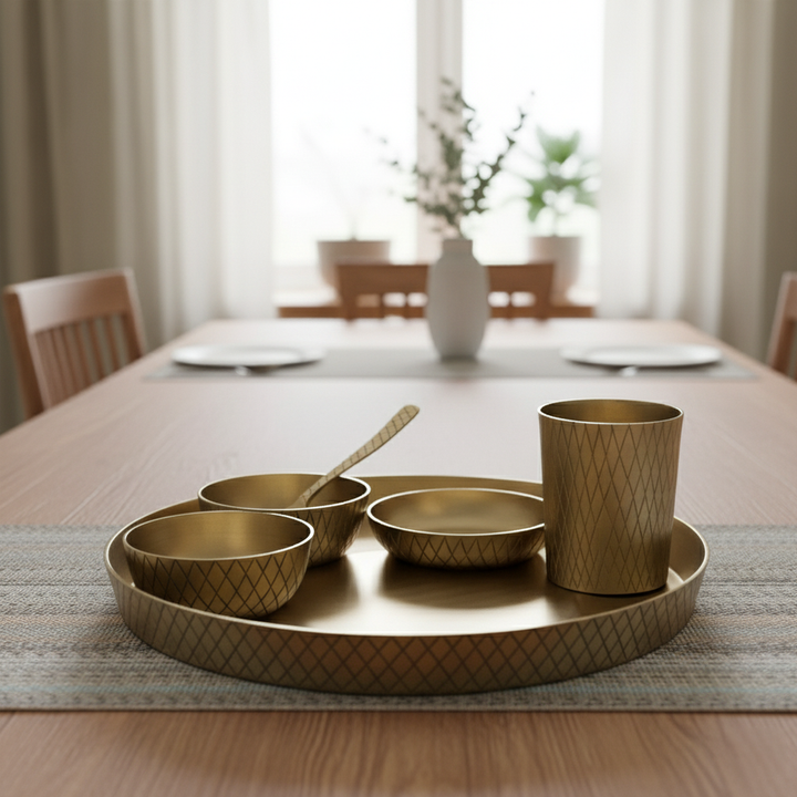 Enhance your dining experience with our comprehensive Kansa utensils set, done in matt finish and cutwork, meticulously crafted to meet your everyday needs. This set includes: