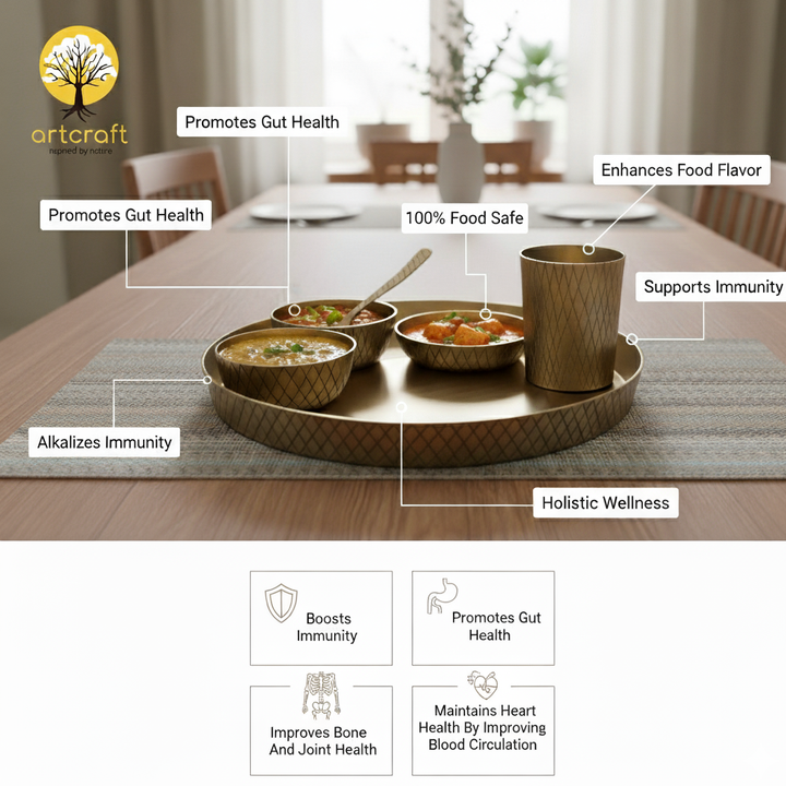 Each piece in this set is crafted from high-quality kansa material, ensuring longevity and practicality in your kitchen or dining area. Elevate your dining table with this essential utensils set that combines functionality with aesthetic appeal.